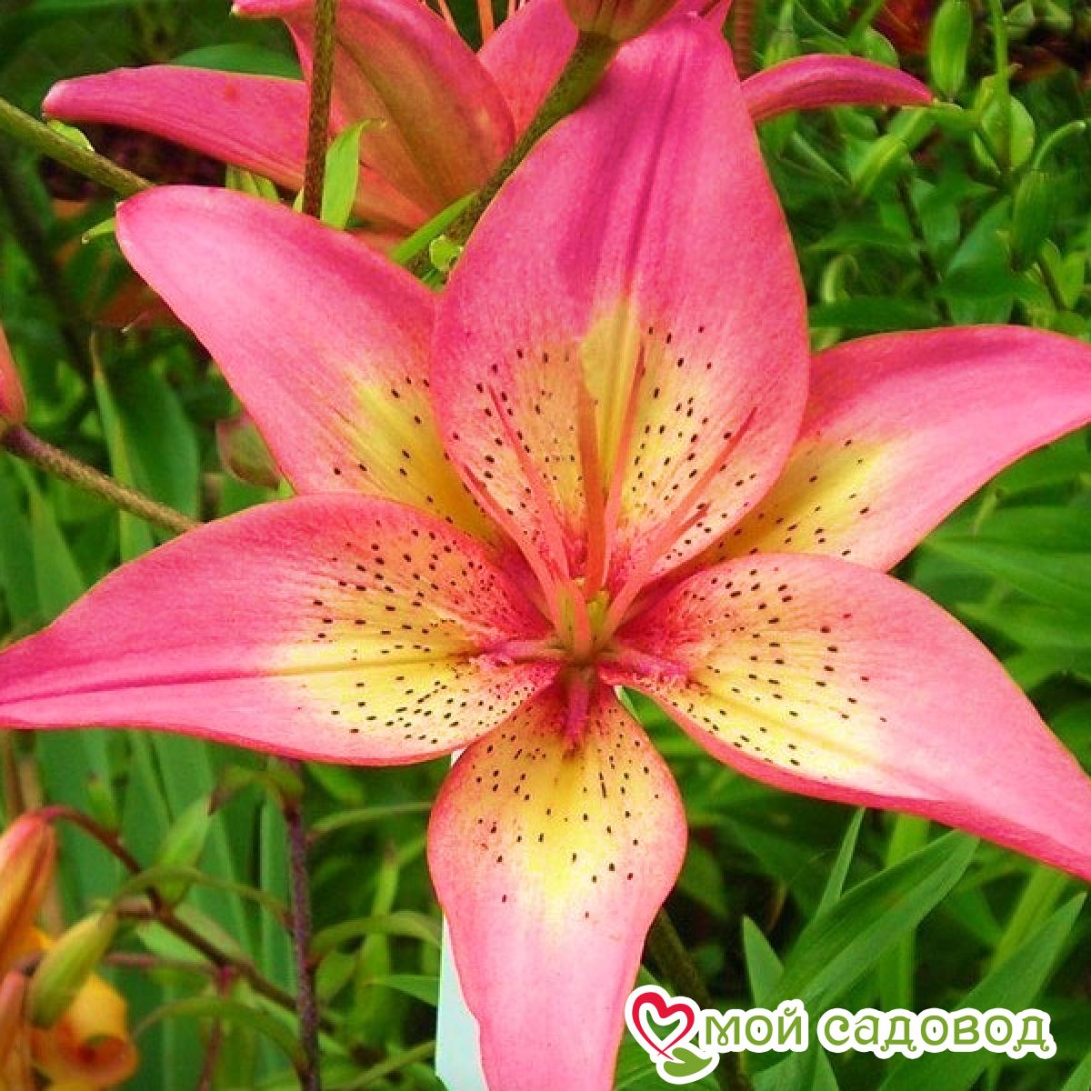 Цветы розового цвета, у горла пастельно-желтые пятна с темными вкраплениями. Без аромата. Диаметр цветка 15 см. Период цветения: июнь/июль. Высота растения достигает 100 см. Сорт достаточно неприхотлив и морозоустойчив. Уход за лилиями включает в себя прополки, поливы, рыхления, подкормки, борьбу с болезнями и вредителями. Поливают лилии в период цветения, поддерживая почву в увлажненном состоянии. Чтобы избежать пересыхания и перегрева почву мульчируют перегноем или торфом слоем в 5-6 см. Лилии хорошо отзываются на подкормки. Первую подкормку проводят весной после схода снега, разбрасывая по поверхности почвы азотные удобрения. Во время бутонизации растения поливают растворенной в воде аммиачной селитрой, непосредственно перед цветением использую фосфорно-калийные удобрения в жидком виде, в конце лета, но не позднее середины августа, лилии подкармливают фосфором и калием. Выращивать лилии на одном месте дольше 3-4 лет крайне нежелательно: луковица нарастает, становится рыхлой, растениям становится тесно по соседству. На 5 -6 год заметно снижается высота цветоноса, количество бутонов и значит, луковица истощена, а это может привести к заболеваниям и гибели растения. Осенью, когда надземная часть растения отмерла, стебель обрезают на высоте 15 см от поверхности почвы, гнездо выкапывают целиком, отделяют от материнской луковицы детки и высаживают их на доращивание. Саму материнскую луковицу пересаживают на новое место. В нашем интернет-магазине вы сможете купить Лилии Так же возможно вас заинтересуют Лилия-дерево Пурпл Принц и Лилия (ЛО-гибрид) Пинк Хевен