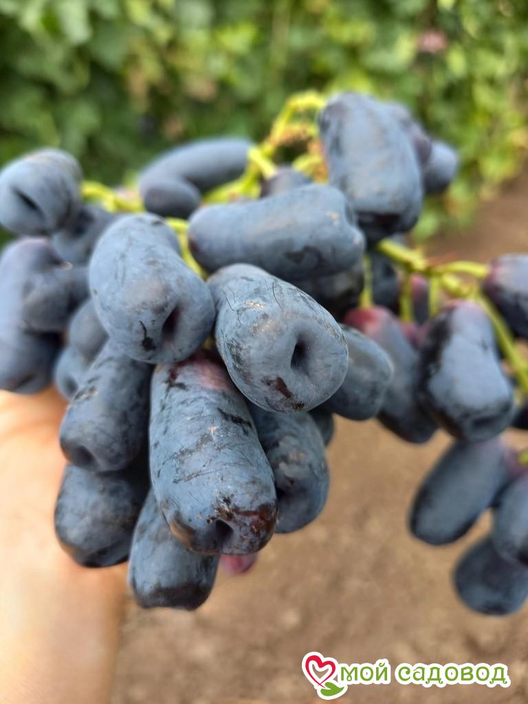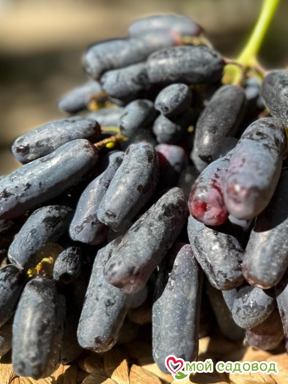 Читать далееВиноград Аватар – одна из последних новинок среди завезенных из-за рубежа селекционных сортов винограда, благодаря оригинальной форме и исключительному вкусу своих ягод постепенно приобретает популярность в разных регионах. Сорт относится к средним по срокам созревания. Ягоды собраны на плотном крепком гребне в аккуратную, не слишком рыхлую гроздь конической формы весом в среднем 1080 г при длине 29-31 см и ширине в 16-29 см. Аватар отличается необычной удлиненной формой ягод с характерной ямочкой на конце. Окраска плодов густого темно-синего, почти черного цвета, кожица очень плотная. Ягоды крупные, с прозрачной плотной хрустящей мякотью, не содержат косточек, предназначены для употребления в свежем виде. Средняя длина зрелой ягоды в грозди 41-50 мм, вес – 10 г. Плоды очень сладкие, сочные, имеют нежный, освежающий вкус.