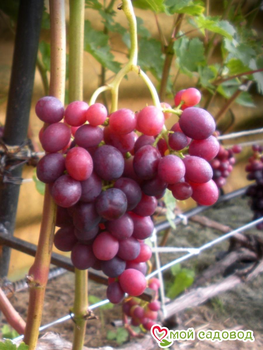 Уход за виноградом сводится к регулярным поливам в сухую погоду, подкормкам и формированию куста. Для подкормки используют минеральные и органические удобрения (перепревший навоз, компост). Ранней весной кусты виноград поливают полным минеральным удобрением, растворенным в воде, перед цветением такую подкормку повторяют. Перед созреванием вносят фосфорно-калийные удобрения, а после сбора урожая проводят подкормку калием для повышения зимостойкости растений. Кроме того для лучшего вызревания лозы рекомендуется удаление пасынков и прищипывание верхушек в начале сентября. Формирование куста Винограда. Для формирования виноградных кустов необходимо установить надежную опору. Самая простая представляет собой два столба с несколькими рядами проволоки между ними. По мере роста побеги подвязывают к проволоке, задавая им нужное направление. Формирование куста винограда начинают с первого года, оставляя не более двух здоровых побегов у основания, остальные выламывают. На второй год на кусте оставляют по три почки на каждом побеге, на третий год на каждом плече оставляют 2-3 сильных побега, остальные удаляют.